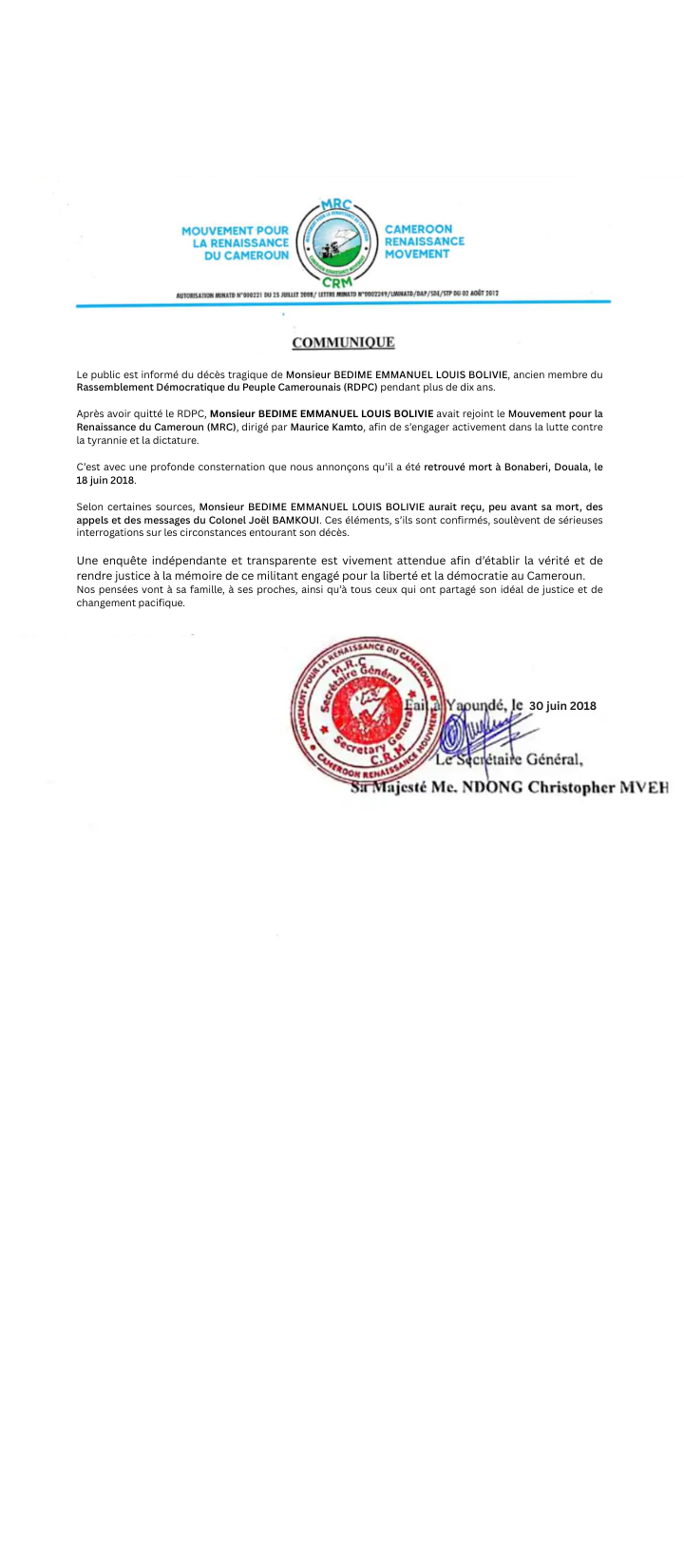 <<Aujourd’hui, un événement majeur vient marquer la scène politique nationale : le Professeur Bédime Emmanuel Louis Bolivie, ancien cadre du RDPC, vient d’annoncer officiellement son adhésion au Mouvement pour la Renaissance du Cameroun (MRC).
